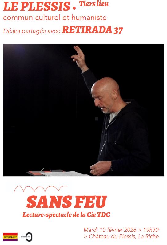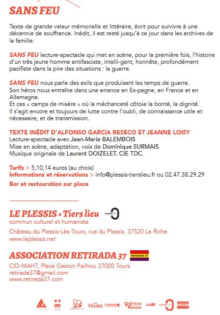 Sans Feu de la Cie TDC – Désirs partagés avec l’association Retirada 37. Un Spectacle au Château du Plessis de La Riche 37 Ce mardi 10 février à 19H30. « Sans Feu » nous parle des exils que produisent les temps de guerre. Son héros nous entraîne dans une errance en Espagne, en France et en Allemagne. Et ces « camps de misère » où la méchanceté côtoie la bonté, la dignité. Il s’agit encore et toujours de lutte contre l’oubli, de connaissance utile et nécessaire, et de transmission.