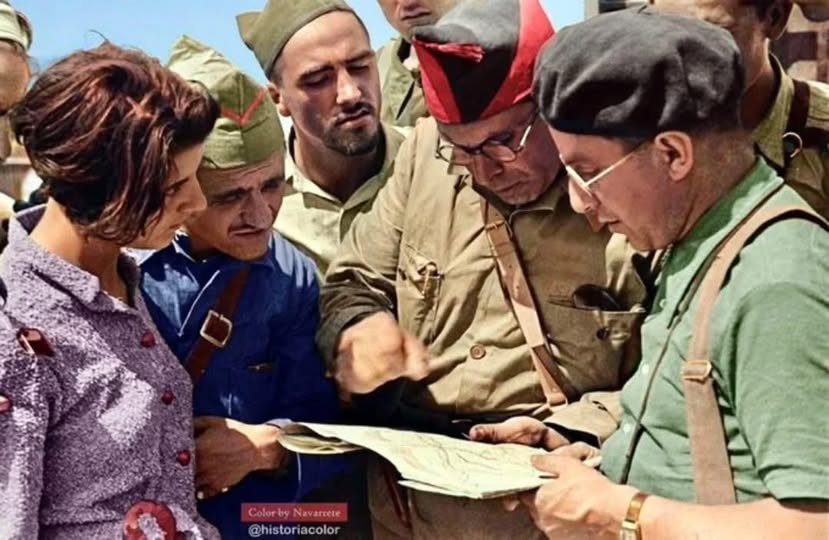 • Sur la photo : Marina Ginestà avec Mikhail Kolstov, correspondant soviétique et peut-être agent de Staline en Espagne. Et au centre, portant une casquette rouge et noire, l’anarchiste révolutionnaire, Buenaventura Durruti. Pendant la guerre civile, le PSUC a chargé Marina Ginestá d’être la traductrice de Mikhail Kolstov. Elle a facilité l’interview entre Durruti et Kolstov. Durruti est mort 3 mois plus tard, d’une « balle perdue ». Kolstov a été exécuté en URSS (purgé) par le régime de Staline en 1940. De nombreuses années après ces événements, Marina a déclaré que le ton de l’interview entre Durruti et Kolstov était critique envers Staline et que ce fait aurait été la cause de leur mort. Cette photo a été prise par Hans Gutmann (Juan Guzmán).