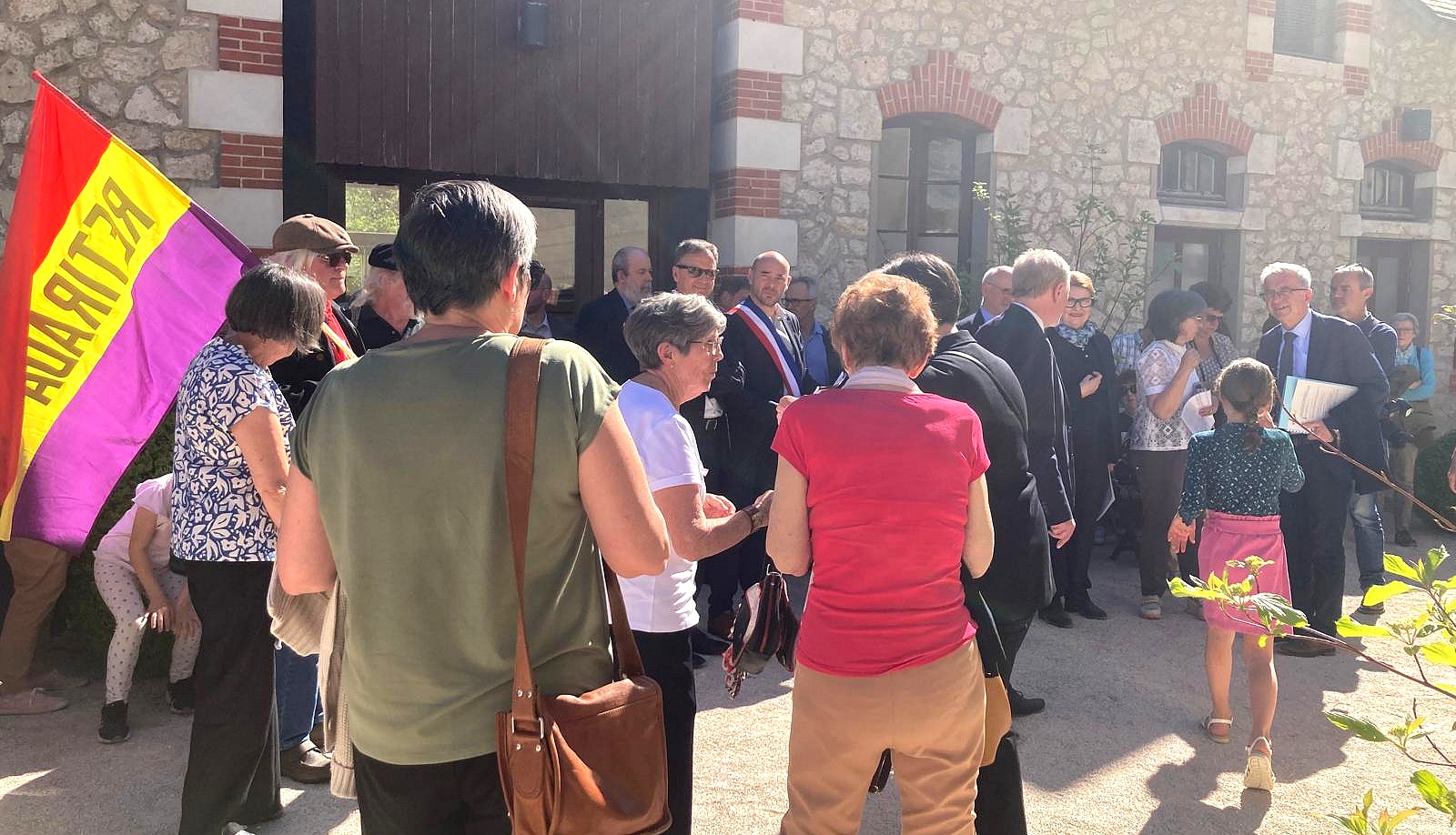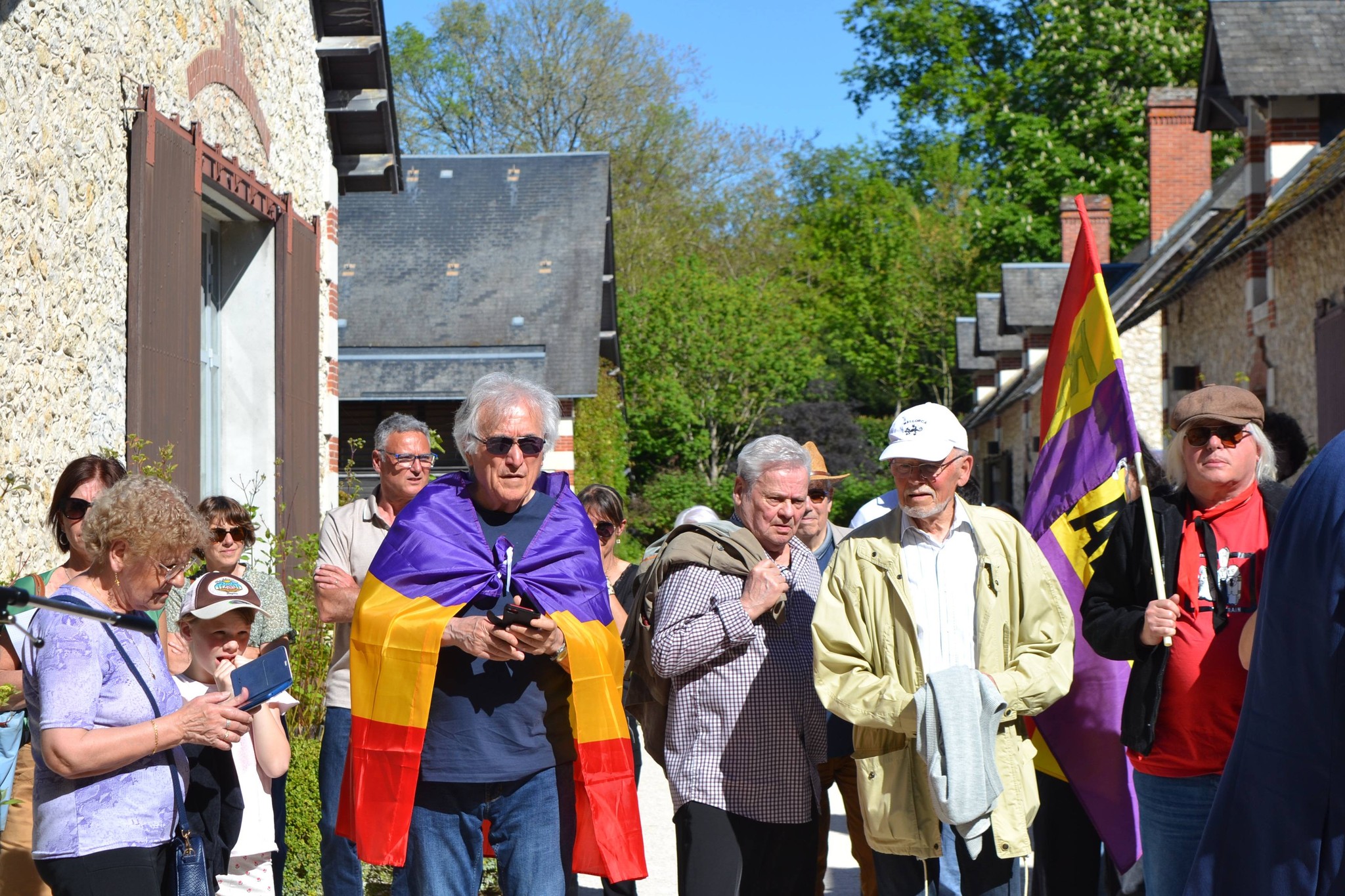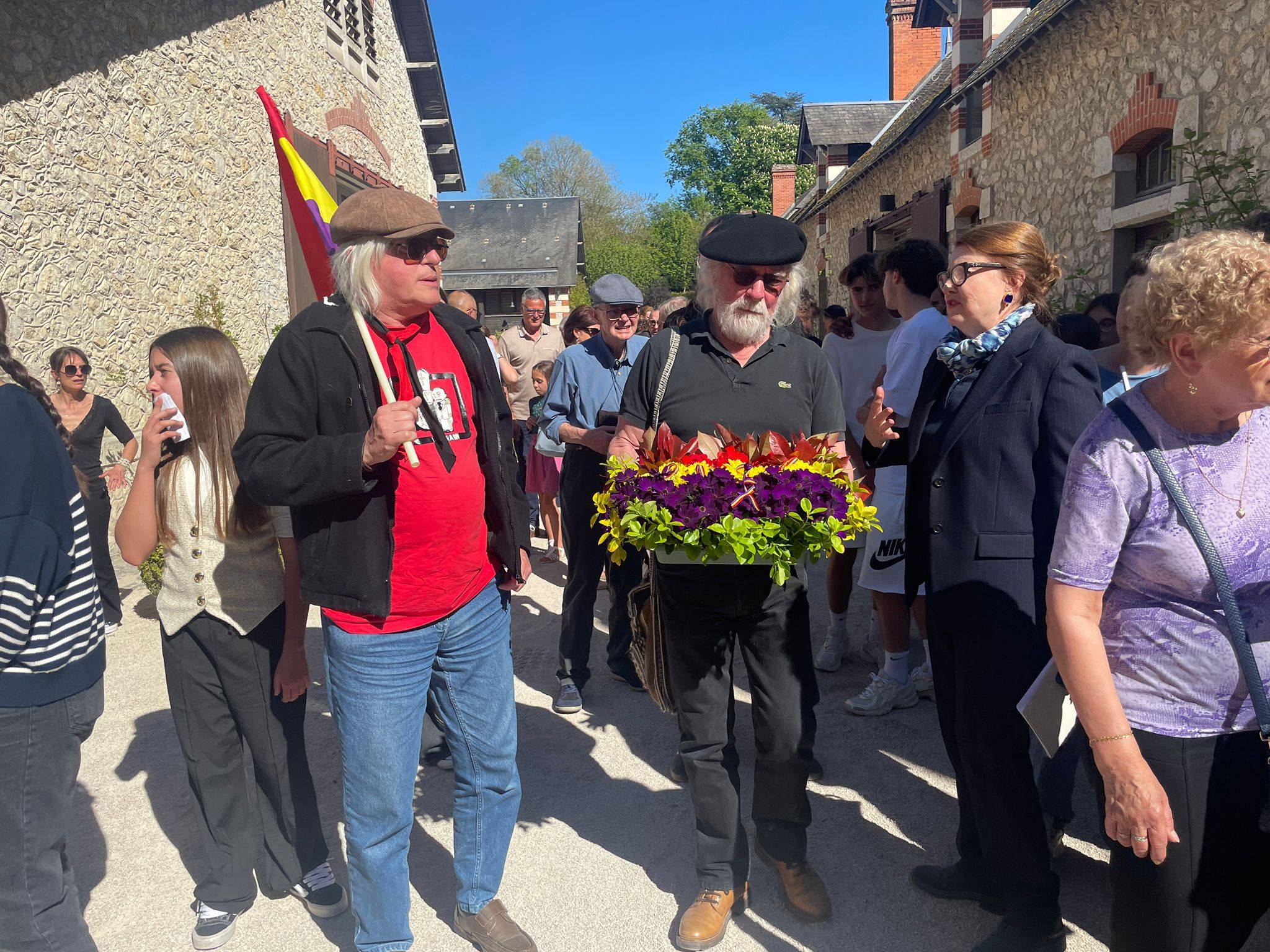 Autour d’elle, ce 7 avril 2026, il y avait des descendants, des collégiens, des enseignants, des élus, des représentants associatifs, le Souvenir Français, un représentant de l’ambassade d’Espagne, des drapeaux républicains espagnols dans l’assemblée, des applaudissements, des regards très attentifs. Il y avait aussi, dans ce lieu aujourd’hui associé à l’art, aux jardins et à la beauté du domaine, une impression tenace de décalage. Car ce mur paisible, cette cour ensoleillée, ces façades ordonnées, renvoient soudain à une autre réalité : celle d’un accueil d’urgence, d’un exil massif, de familles déplacées, de femmes et d’enfants arrivés ici après la débâcle de la guerre civile, et la Retirada.