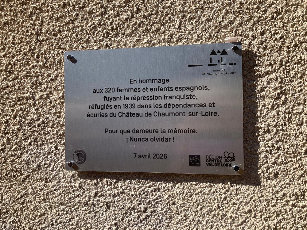 Au mur, la plaque est sobre, nette, presque austère. Mais elle dit l’essentiel : un hommage, un lieu, une date, un exil. Elle rappelle qu’en 1939, ici, dans les dépendances et les écuries du château de Chaumont-sur-Loire, furent accueillis des réfugiés espagnols fuyant la répression franquiste. Plus bas, une formule simple enfonce le clou : « Pour que demeure la mémoire. ¡Nunca olvidar! » (Ne jamais oublier)